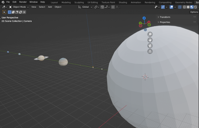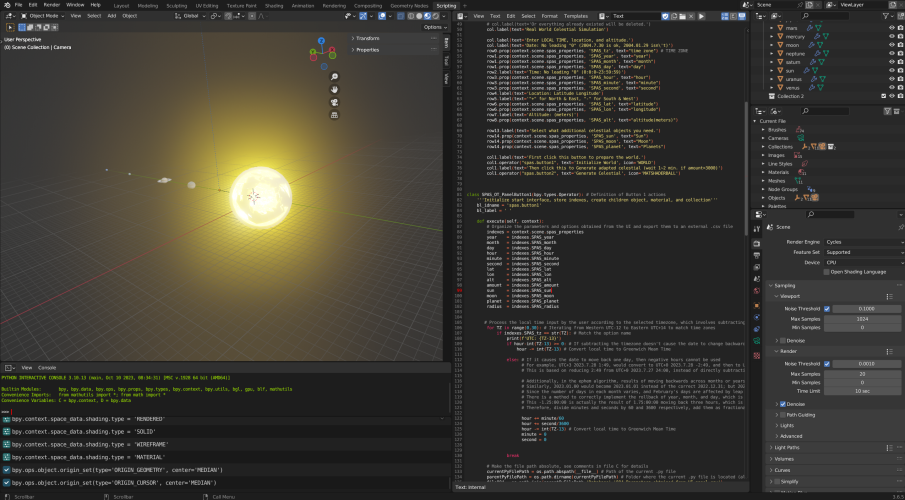 This is one of the many windows in Blender for the SkyTracker (aks Virtual Night Sky) model development. A final rendered model of the Solar System with a real night sky image as the background will be added soon. | A Full-Screen view of the SkyTracker Blender window A full window screenshot taken during the development of the SkyTracker Blender Model. 3D-viewport, Script editor, (object) Properties window, Scene, ViewLayer, and Console are displayed. |