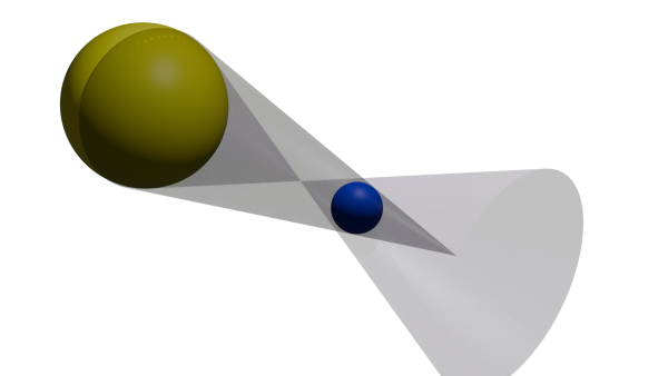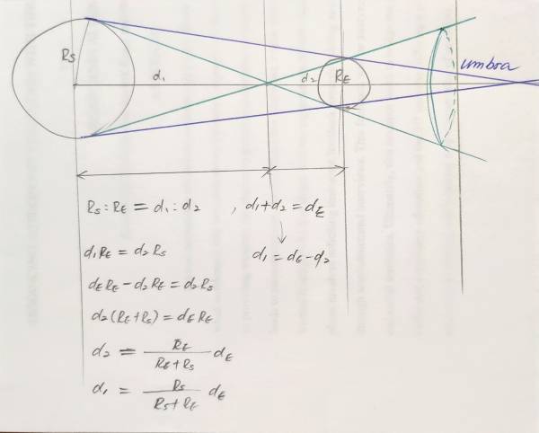 Tracking Shadow conic regions Using three cones as shown in the below image, we can track the umbra and penumbra regions. Relative sizes and positions of these cones can be determined from radii of the Sun and Earth (or Moon) and the distance between them.